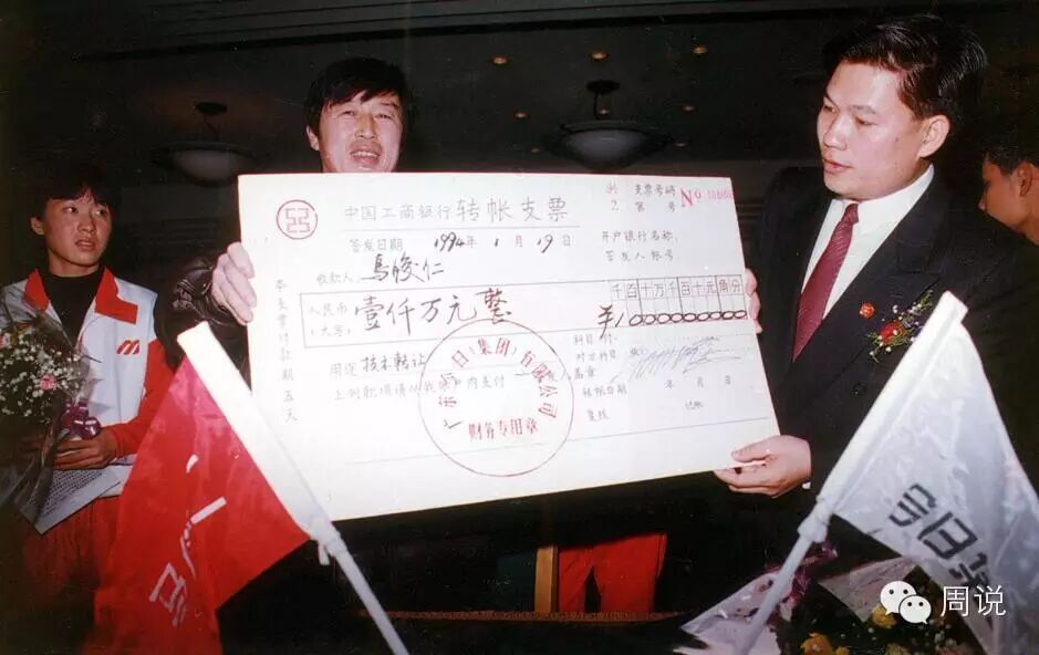 跑道上的成功,也为“马家军”赢得了商业机遇。从1993年秋天至1994年广岛亚运会期间,马俊仁让队医开出几味常用药的配方,以1000万元人民币的价格卖给一家广东的饮料制造商,“生命核能”口服液由此诞生;马俊仁还率众弟子接拍“中华鳖精”广告。广告片中,他以特有的嘶哑嗓音吼出了一句台词:“我们常喝中华鳖精”。图为1994年1月19日,马俊仁(左)以1000万人民币将他的“生命核能”配方技术转让给广东今日集团。