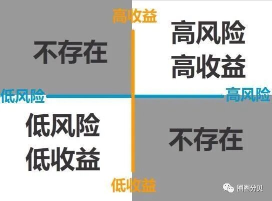 1. 风险 - 主要强调个人投资风险偏好和对风险收益比的标准。 这个概念,介绍的文章已经蛮多了,在此就不赘述了。下面这个图,还是蛮有用的,特别是当有人告诉你一个“高收益、低风险”的产品,那么你就要小心了。