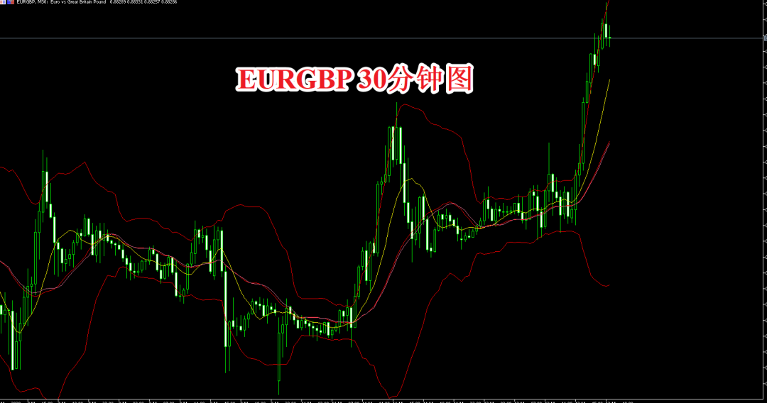 以下面两个图为例,外汇市场 欧元兑英镑的30分钟图(里面每一个线条代表30分钟),可以看到,这个是正在走强势上涨的格局,趋势在涨,应该大胆买入。