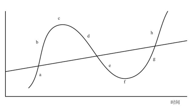 这其实就是周期,下面是一个周期的示意图, 你只要看上几秒钟就会明白,周期性现象的运动过程,其实不难理解,你只要将它分成几个可以被识别的阶段就明白了:复苏阶段(a):从一个受到过度压制形成的底部极端点,或者“谷底”,开始复苏,移向中心点,或者向均值回归。(b):继续摆动,经过中心点,冲向顶部的极端点,或者“顶峰”。筑顶阶段(c):形成一个顶峰。反转阶段(d):从顶峰开始反转,向下修正,移向中心点,或者向均值回归。下跌阶段(e):继续向下运动,经过中心点,而且继续移向一个新的谷底。筑底阶段(f):形成一个底部。再次复苏阶段(g):又一次开始复苏,从谷底开始反转,向中心点回归,即均值回归。再次上涨阶段(h):接下来,又一次持续震荡上行,经过中心点,而且移向另外一个新的顶峰。