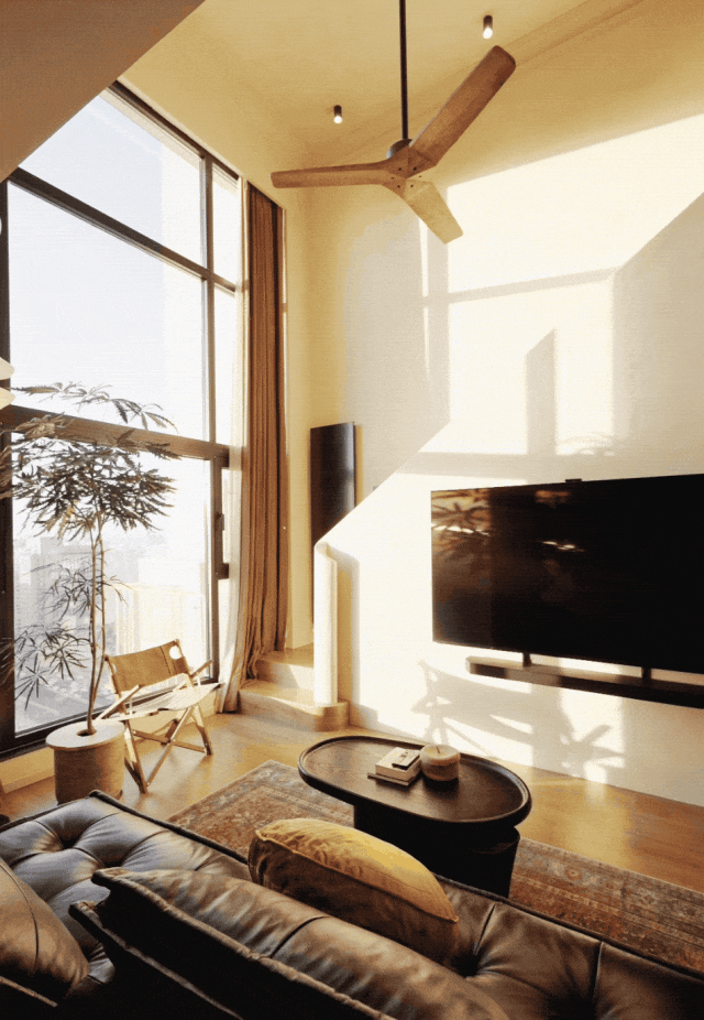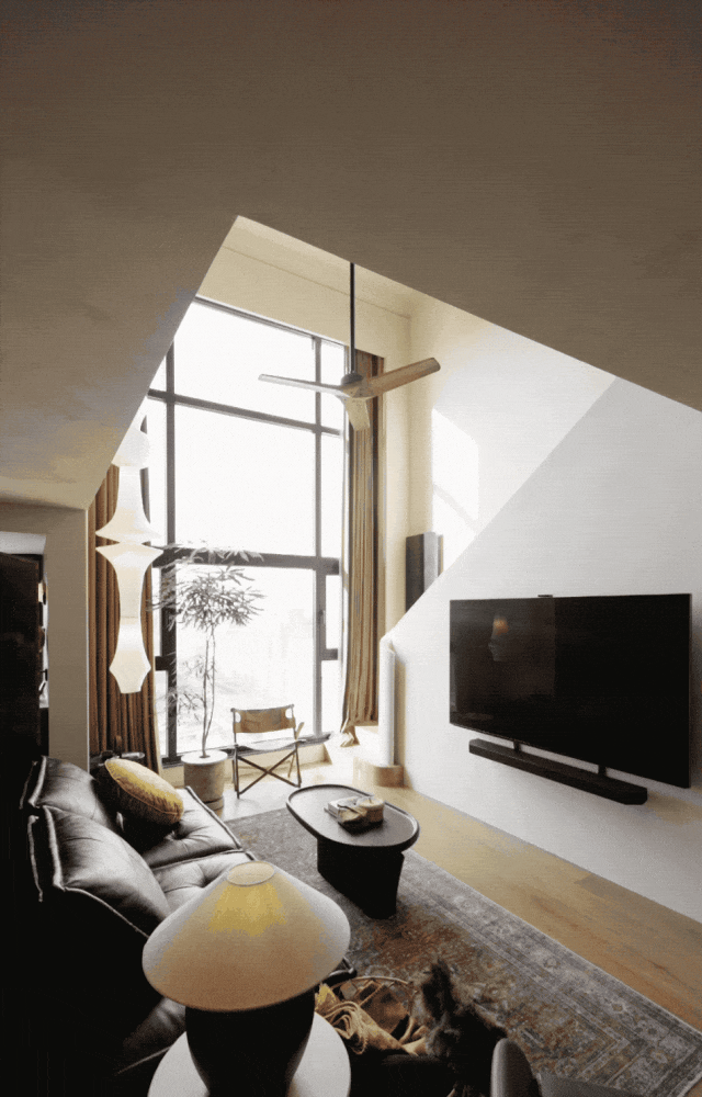 蓬蓬和小黄是大学同学,毕业后分隔两地。多年后,小黄恰好到蓬蓬所在的城市拍戏,两人重新联系上,逐渐发展为恋人,不久便步入婚姻。小黄是一名影视工作者,蓬蓬曾从事广告行业,很长的一段时间里,两人的工作都是快节奏、高强度。“我们这一代人从小就很‘卷’,但以前的‘卷’还是有喘息的时候,也不知道从什么时候开始,就觉得喘不过来气了。” 他们希望有一个符合自己的生活需求和审美喜好的家,可以在舒适的空间里充分放松。2022年,夫妻俩买下朝阳区中心的这套57m²Loft作为婚房,进行了一场大改造。房子原本的格局是两层,楼梯在玄关处,整体显得拥挤、不通透。发现所有的承重墙都分布在四周后,两人做了个大胆的决定:把一楼客厅的天花板(即原二楼地板)拆除,楼梯挪到侧墙,腾出一整个挑高4.8米的开放空间,和一整面巨大的落地窗,视野十分开阔,窗外就是北京标志性的“大裤衩”。白天,阳光充足,光影在整个家中缓慢流淌;傍晚,落日浸染整片CBD,坐拥北京最酷窗景。“我们俩不太在乎房型、朝向,选这个房子就是看上了风景。” 蓬蓬告诉我们。“拥有一扇可以看到全城景观的窗,会觉得跟这个城市既是一体的,又可以有一点距离。”