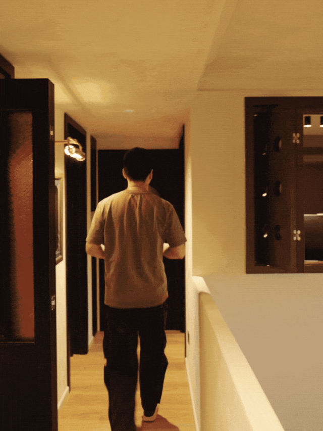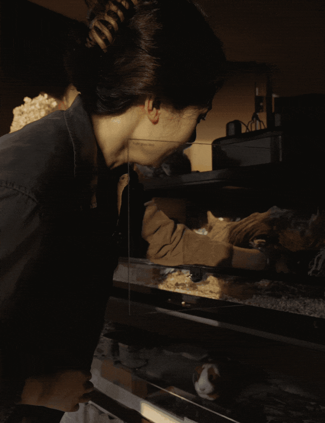 卫生间依然是黑白相间的复古色调,设有一个圆形的浴缸。小黄是东北人,喜欢泡澡,同时作为影视工作者,“也会通过泡澡去找灵感,在浴缸里写东西。”书房则是小黄的工作区,“健身角,书桌,唱片机都在里面,” 蓬蓬说,“那是他的快乐天地。”两人没有孩子,但家中有7只小动物同住。“它们是重要的家庭成员,生活起居一直都在我们的考量里面。” 蓬蓬强调,家里也为小动物们分别设计了专属空间,“一家九口”各得其所。柴犬nunu的小房间在一楼玄关旁,连着储物柜给它打了一个带栅栏门的空间,它的各种用品就收在“楼上”的柜子里。两只猫很黏人,夫妻俩专门在卧室门上开了一个小猫门,“方便它们随时骚扰我们。”鬃狮蜥、荷兰猪等四只小宠则被安置在厨房边的阳台,离阳光和水源最近的地方。蓬蓬介绍,“我们连着岛台打了一个四层楼的’小宠公寓’,在厨房做饭的时候,时不时还能顺便扔几片菜叶给里面的’房客’。”夫妻俩告诉我们,和小动物们一起生活在这样一个符合自己的需求、审美,可以让人放松充电的小空间,是他们能想到最幸福的生活图景。我和小黄是“机缘巧合”在一起的。我们是大学同学,毕业后,我们分开发展,一直不在同个城市。过了挺多年,小黄去上海拍戏,我们重新联系上,慢慢从朋友变成恋人。后来,我辞掉了上海的工作,来到北京一家设计工作室做运营,也跟小黄结了婚。我们两个相处分为两种模式——他在家和他不在家的模式。小黄会经常到外地拍戏,一去就是好几个月,最长一次异地大概有半年时间。他说我们感情稳定是因为我能理解他,但我觉得不能用包容去形容这个状态。他在追寻他的梦想,我做我自己的事情,又彼此陪伴,更像是两个人一起去追寻自己想要的生活。这种相处模式延续到了我们家的设计上:楼上楼下所有空间都是开放、连通,又可以选择封闭的,无论在哪个角落,各自在忙什么事,都可以感受到对方的存在。小黄在楼上办公,我在楼下追剧,他站起来就能看到我看到哪了。要吃饭了,我就在楼下喊一嗓子。这种不用对话也能拥有的陪伴感,可能是我最喜欢这个家的地方。这个家的成员总共是一家9口,老大是一只橘猫叫nomi,老二是一只柴犬叫nunu,老小叫脑斧,中间还有好几只小宠。nomi和nunu从上海到北京跟着我搬了大概五六个家,陪伴了我很久。现在很多年轻人觉得养宠物就已经像是在养小孩了,我们确实也经常开玩笑说,这跟自己生的有什么区别,但也知道养宠物跟养孩子的辛苦还是没有办法比的。我们俩目前还是以事业为重,但养小孩是需要两个人全情参与的事情,如果交给某一个人来负责,对孩子也不负责任。所以暂时把生小孩这个计划搁置了。我们在事业上规划性特别强,但在生活中就会相对随性一点。现在的生活对我们来说已经是最理想的状态,未来可能会再有新的理想,但那就是下一步的事情啦。我们都觉得搬到这个家以后,才真正开始过日子。之前工作带给我们的焦虑情绪很重,要一直往前“努着劲儿”,白天忙事业,回到家就是睡觉,房子只是一个晚上休息的地方。搬到这里之后,不但松弛下来,生活也变得丰富饱满了,会意识到人生不只有工作。原来做一下改变,生活可以整个都不一样。当然小黄还是会在家办公,但是体验完全不同了。我们的窗户朝西,夕阳在下午四五点时洒进来,感受到光线变化,他就会走到窗边让自己休息一会儿。他说这样看看景色再回去工作,心里更有力量了。虽然大环境还是“卷”的状态,但现在,我们更有对生活的掌控感了,好像可以根据自己的节奏“卷”了。我想,人还是要保持对美好生活的追求,在“卷”的同时善待一下自己,才可能有更大的空间去努力。