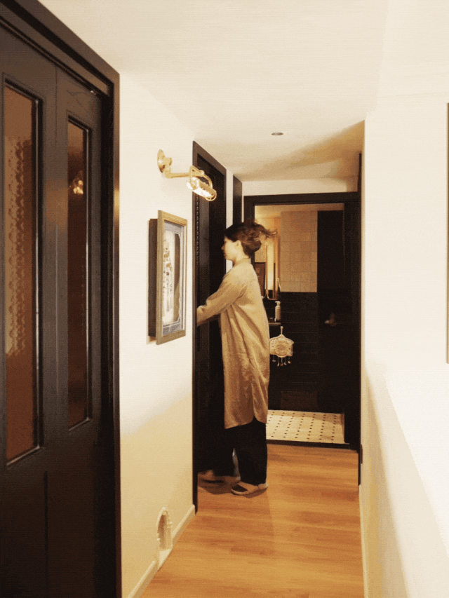 小黄从事影视工作,曾参与多部年代戏的拍摄。耳濡目染的审美熏陶,具象成家中各种细节:海棠花玻璃、格纹拼贴瓷砖地板等