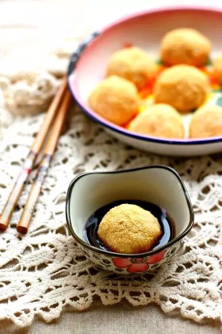 这是三颗自带“Duang~Duang~Duang~"特效的黄豆粉糯米团子——先用木槌舂好刚煮好热腾腾的糯米饭,然后一名大汉会手掏三颗团子出来,连续斜打出去,将糯米团子打入装有黄豆面的簸箕内,团子会经过一面木板,打在木板上的三声响,就是它得名的原因。所以,其实这是一道颇具观赏性的小吃,梦厂喜欢它,除了因为浇上红糖芝麻的三大炮本身挺好吃,更因为现在这样制法传统又有趣的小吃不多啦,梦厂很珍惜呢~