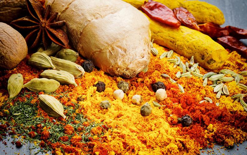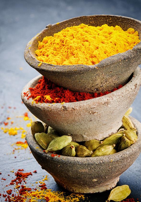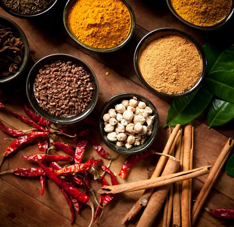 咖喱对印度人来说,就是“把许多香料混合在一起煮”的意思,有可能是由数种甚至数十种香料所组成。组成咖喱的香料包括有红辣椒、姜、丁香、肉桂、茴香、小茴香、肉豆蔻、莞荽子、芥末、鼠尾草、黑胡椒以及咖喱的主色——姜黄粉等等。