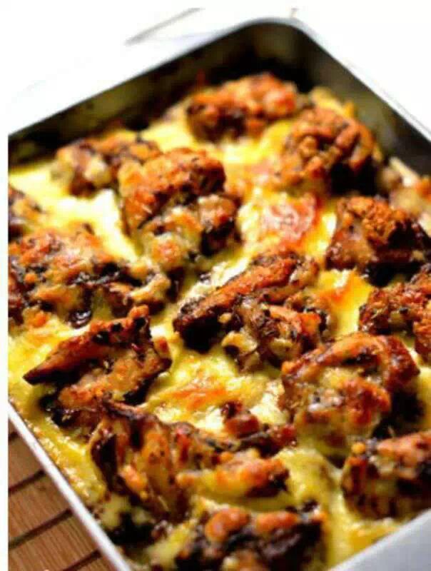 依次放入米饭,橄榄酱,鸡块以及马苏拉里奶酪