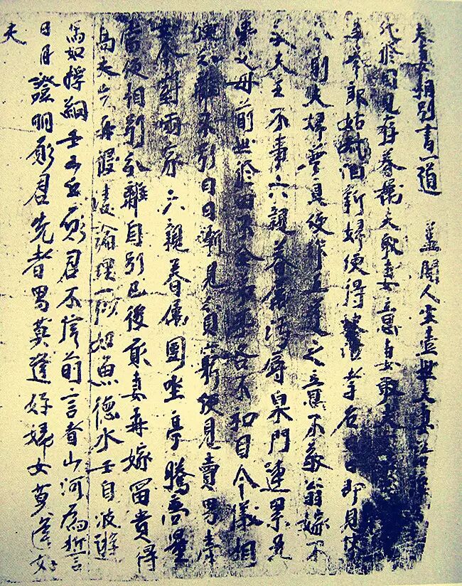 盖闻人生一世,夫妻语让为先。世代修因,见存眷属。夫取妻意,妻取夫言。孝敬二亲,事奉郎姑叔伯,新妇便得孝名,日日即见快欢。今则夫妇无良,便作五逆之意,不敬翁嫁(家),不敬夫主,不事六亲眷属,污辱臬门,连累兄弟父母,前世修因不全,弟互各不和目(睦)。今仪(议)相便分离。不别日日渐见贫穷,便见卖男牵女。今对两家六亲眷属,团坐亭藤商量,当便相别分离。自别已后,愿妻再嫁,富贵得高,夫主不再侵凌论理,一似如鱼得水,任自波游;马如捋纲壬(任)山丘。愿君不信前言者,山河为誓,日月证明。愿君先者,男莫逢好妇,女莫奉好夫。