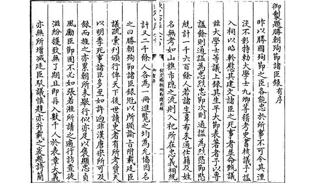首先,乾隆下令扩大表彰前明忠臣的范围,不仅在书中加入了明初“靖难之变”的殉难者;还在书中收录了大量死于“不敢从贼”者,也就是对李自成起义军进行抵抗的殉难者。总之,全书真正意义上的抗清死难者比例只有两成多一点,由此,乾隆既肯定了南明抗清者的忠节,又极大淡化了《钦定胜朝殉节诸臣录》的抗清色彩,让这本书成为了一本“宣扬忠臣价值观”更为集中的健康读物。