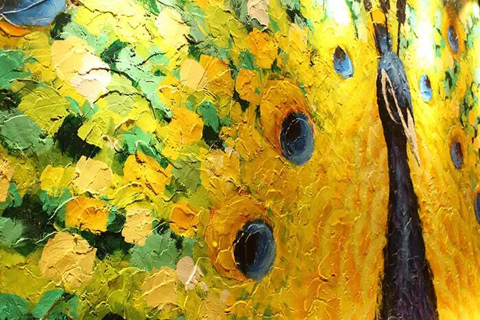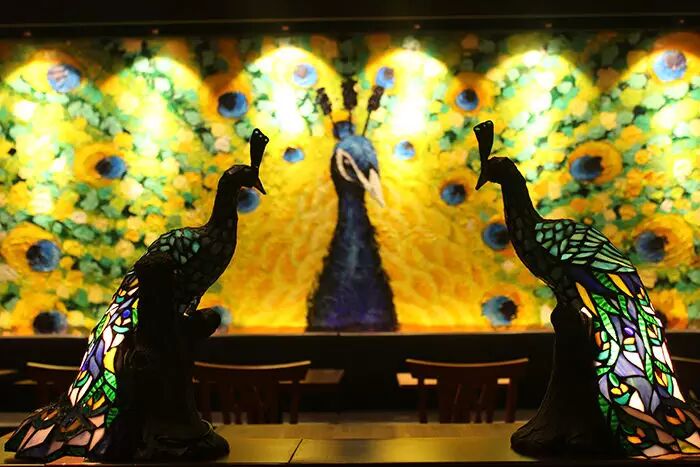 甫一进门,梦厂还没来得及发问,先被扑面而来的浓艳色彩震了个机灵:墙壁和屋顶上攀爬着好多好多怒放的花朵,连枝带叶的,在深深浅浅的墨绿嫩绿里,弯曲出风情万种的花纹。房梁挂着一列金色雀笼,我还在疑惑怎么没有鸟,就看到一只美得吓人的巨大孔雀,用金绿交杂的羽屏霸占了小馆的整面墙壁——虽然是画,可那也好像是因为笼子关不住它,才画在那儿似的。