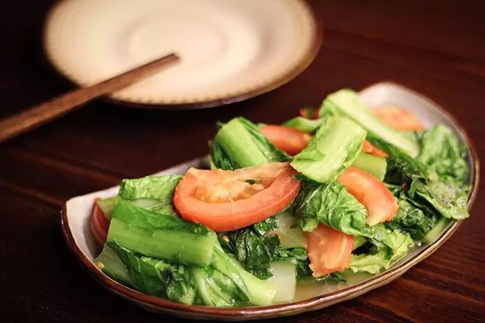 素炒小白菜 第一次吃到用番茄炒的小白菜,出乎意料的搭! 已列入【梦厂自家豪华山寨菜单】 不知道用家常调料是不是也能做出这个味儿?