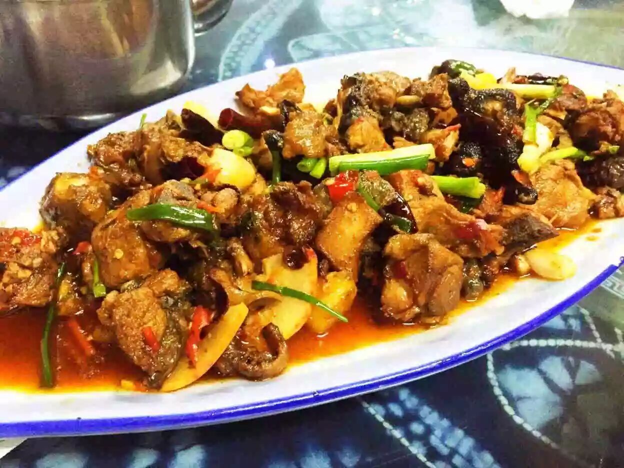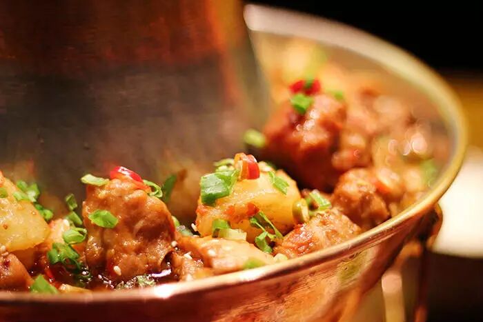 米酒清了口也开了胃,老板娘宣布上菜。第一道端上桌的居然是口金黄大锅——火烧云的招牌菜,铜锅油焖鸡。眼见食材在锅边堆得快满出来,铜锅的保温性又向来给力,汤汁咕嘟咕嘟的,怂恿着锅中物跳离这滚烫的金属,梦厂赶紧挑了一块白白嫩嫩的戳进嘴里,结果是土豆,软得好可怕,一抿就没了!在我吃过的各种土豆里,除了土豆泥大概就属它最软了,还裹着汁儿,拿它就米饭,一抿连米饭都化在口里了。这菜果然够招牌,好家伙……光土豆就能抵别家的招牌了啊!
