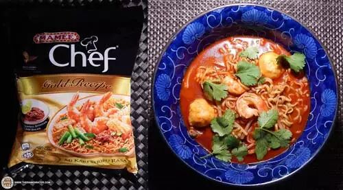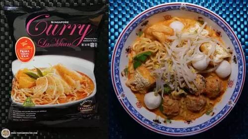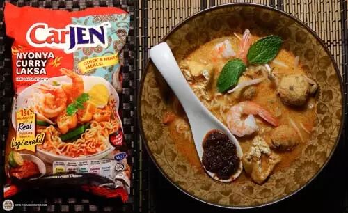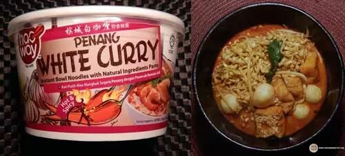 博主评语:面条厚实劲道,得多花些时间才能煮透,但是等待是值得的。调料真心奢华——有一大包酱料和一大包椰浆粉,这样配出来的汤头非常浓郁,咖喱味道也很赞。