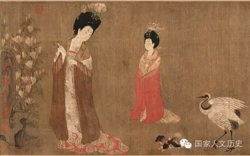 《簪花仕女图》(局部),唐,周昉作,现藏辽宁省博物馆。画中描绘几位衣着艳丽的贵族妇女春夏之交赏花游园的情景,高髻簪花、晕淡眉目,露胸披纱等突出反映了中唐仕女形象的特征,是世界范围内唯一认定的唐代仕女画传世孤本