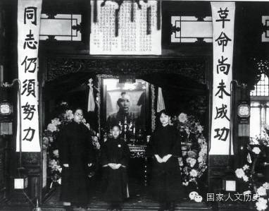 1925年3月12日,孙中山在北京逝世,宋庆龄(右)、孙中山长子孙科 (左)、孙科儿子(中)灵堂前。 灵堂两侧挂着挽联:“革命尚未成功,同志仍需努力。”