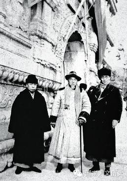 1928年12月下旬,林森(中)、吴铁城(右)、郑洪年(左)在北京香山碧云寺石塔,南京国民政府特派三人赴北京迎接孙中山灵榇南下