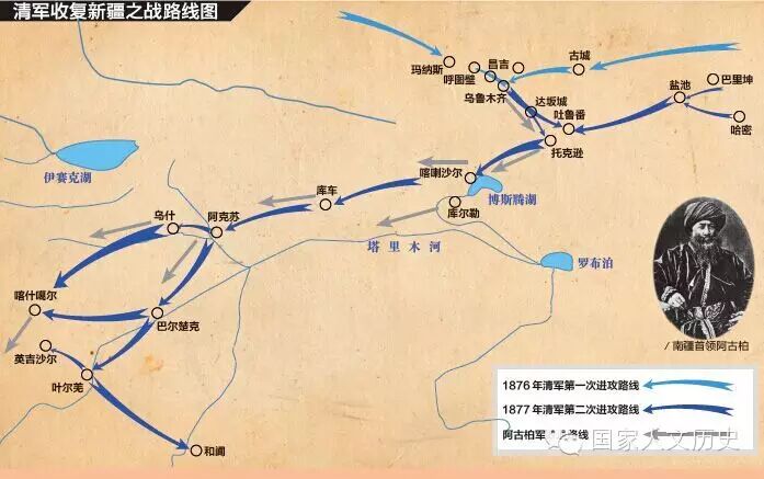 差不多在南疆爆发起义的同时,天京失陷,太平天国运动走向终结,大清帝国的首次近代化的努力——洋务运动也开始兴起。当时的史家不无溢美地将这段时期称为“同治中兴”。庞大的帝国在付出骇人的代价:中国人口从1851年的4.36亿,减少到1867年的大约2.8亿。之后,终于开始缓慢地恢复秩序和元气,“收复阿古柏窃据的新疆地区”随即摆上了清廷的议事日程。1873年11月,时任陕甘总督的“中兴名臣”左宗棠调兵遣将,准备发兵新疆。
