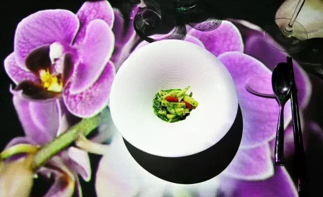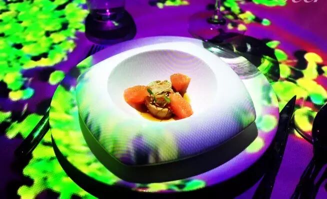 简单来说,就是用利先进的高科技全息声光的方式,把用餐的周遭环境和菜品以一种梦幻绚丽的方式立体地呈现出来。