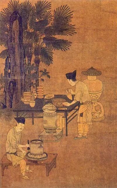 烹茶之时,从茶焙笼取出茶饼,用茶槌捣成小块,再用茶磨或茶碾研成粉末(茶多用磨,茶少用碾),还要用罗合筛过,以确保茶末都是均匀的粉末状。茶末研好之后,便可以冲茶了。先用茶釜将净水烧开;随后马上调茶膏,每只茶盏舀一勺子茶末放入,注入少量开水,将其调成膏状。然后,一边冲入开水,一边用茶笕击拂,使水与茶末交融,并泛起茶沫。击拂数次,一盏清香四溢的宋式热茶就出炉了。这个烹茶的过程,宋人称之为“点茶”。