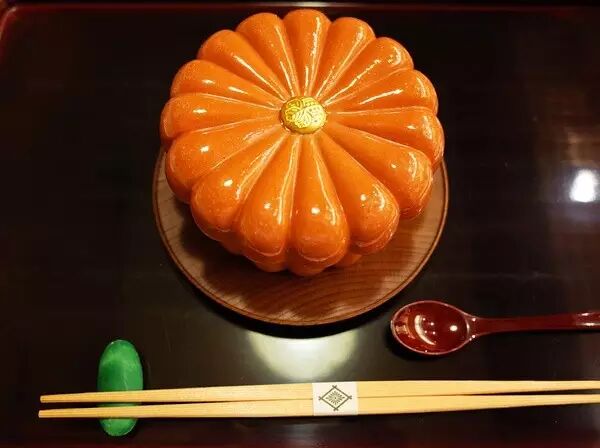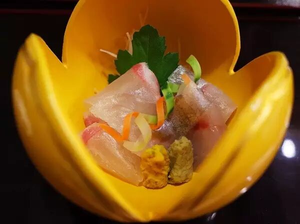 菊乃井还真是充满菊花元素,餐前酒是菊花酒,第一道是放在菊花形陶器里的 “猪口 ”,词源来于像野猪嘴的形状,原意是喝日本酒、用汁蘸荞麦面时用的小容器,也会作为盛放和调味拌菜, 和醋拌凉菜这种少量料理的食器。