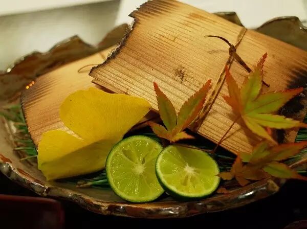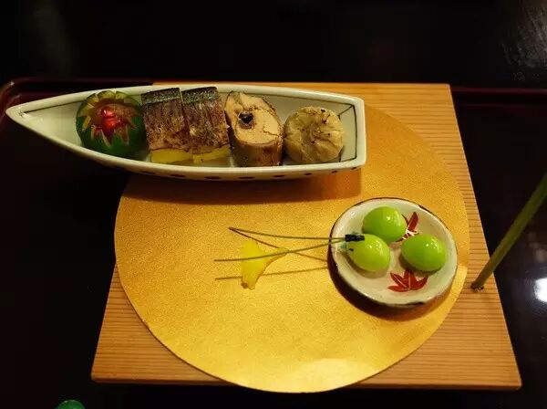 接着是比较简单的八寸,主打秋天银杏元素,中间摆着一片炸脆的薯片口感银杏叶,小碟里是银杏,松叶是海苔裹脆素面,总之除了橘子皮和插着的拉风穗杆,其他都可以食用。舟形小碟里从左往右依次是绍兴酒腌虾、藏红花染色的秋刀鱼寿司、带鱼籽的香鱼鞍马煮、茶巾栗。