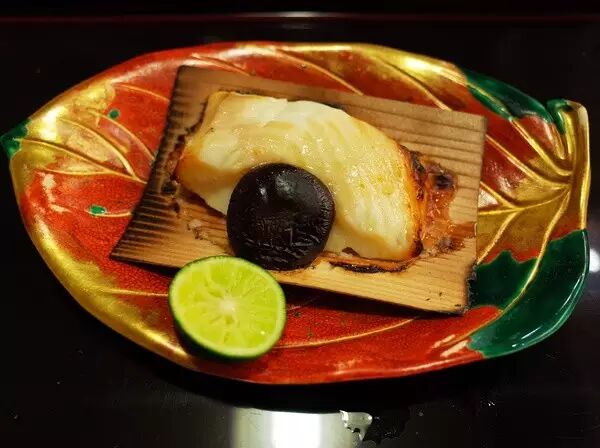 第五道烧物是我最喜欢鱼之一“鰈鱼”,烤起来,油脂中泛着一股淡淡的甜香,尤其这回是放在杉树皮上,配着香菇烤的。用来分装的盘子分棕色和红色两种,我选的红色,都是金碧辉煌的薄陶器,看上去还真是雍容华贵。