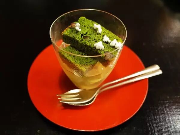 甜品有两种可以选,这就是两个人来吃饭的好处了,不用说一定是一人一样。同伴是茶的cocktail,底下是茶啫喱,上半部分是茶蜂蜜蛋糕;我选的是蜂蜜柠檬果子露和糖浆洋梨,配色大赞。