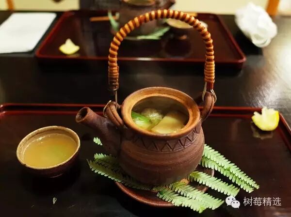 打开盖子一看,果然又是海鳗加松茸和鸭儿芹,这个季节去吃怀石,没有一餐不是海鳗加松茸啊,大多做成汤物,吃多了也不觉得特别鲜美。不知为何此时好像突然降温似得,一阵寒气,上来一壶酸酸的热汤喝起来简直太舒服。