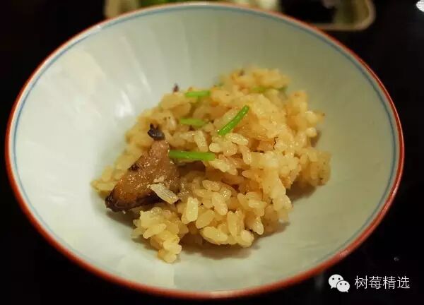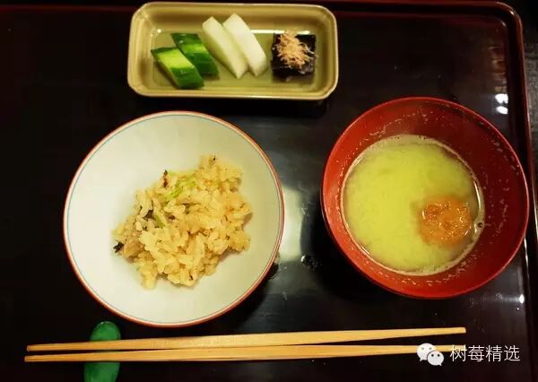 果然又是松茸和鸭儿芹蒸饭,渍物是中规中矩的昆布、黄瓜、萝卜。惊喜的是毛豆磨碎后加入汤里的味噌汁,里面是用百合做的年糕,在普通糯糯的年糕里带有沙沙的口感,跳出普通味噌汁的框框,这一碗大大好评。