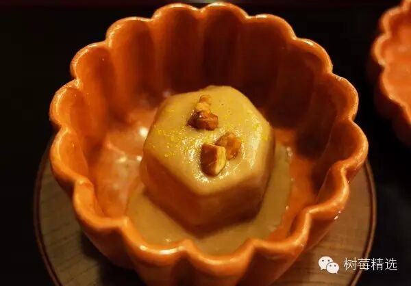 小的芜菁上面浇核桃味噌酱和核桃,撒柚子碎调味。作为秋天的开胃菜,胡桃与柚子这种浓腻和清新的搭配恰到好处,芜菁煮得酥烂。