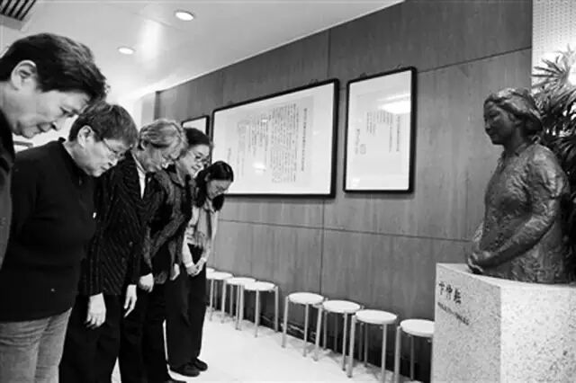 宋彬彬(中)和当年其他红卫兵一起在卞仲耘半身像前洒泪鞠躬