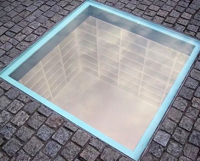 在反法西斯战争胜利五十周年的1995年,柏林市政府在当年焚书的剧院广场、现在改名为倍倍尔广场(Bebelplatz) 上建立起一座寓意深刻、无书的“图书馆纪念碑”,以警醒后人千万不要忘记这象征着专制、愚昧和自己民族耻辱的历史一幕。这座由犹太雕塑家米夏·乌尔曼设计的造型别致的纪念碑建在广场的地下,深达5.3米,面积近50平方米,在这全白色的地下室里放置着水泥制成的书架,但书架上却空空荡荡,一无所有,恰好是放两万册图书的空间。纪念碑由一块大玻璃覆盖在地面,昼夜有灯光照明,观众可透过玻璃俯身下望,面对这一片由浩劫造成的“空白”来对历史作深长之思。