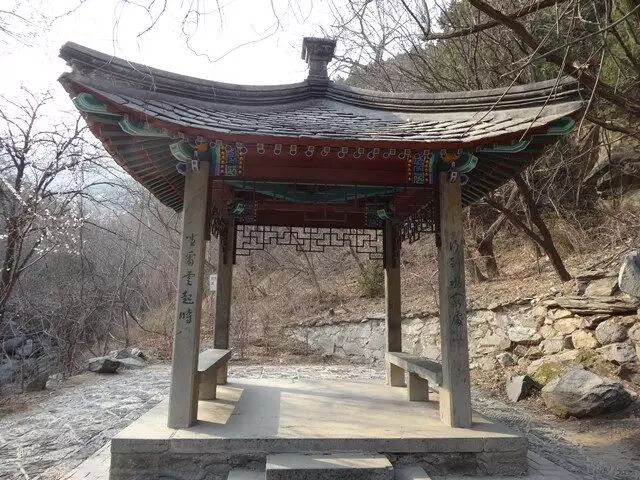 (3)观音阁,建造在卧佛寺西有一整块大磐石之上,今天已由“阁”改“亭”了。