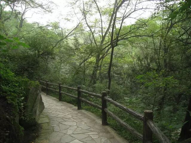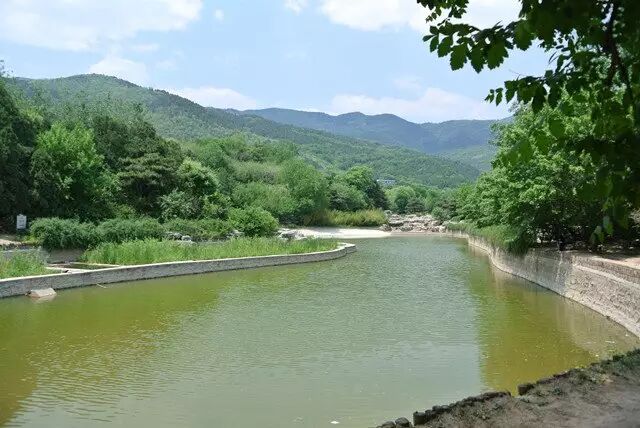 沿溪水而上则山路由阔转狭,直至路绝。这一路,心随景变,开始是一派阳光绚烂,远山葱茏,近水鳞波,鲜花芦苇不经意间三两点缀,只是平实而从容的山水美景而已,并无奇特。但越往深处走,则光线趋暗,上世纪70年代在北京实验成功的南方水杉参天蔽日,竟然密实地布满溪流两岸,夹出曲折栈道。风起清凉,有两侧山峰逐渐紧凑逼仄,奇石兀立,而溪流之水愈加急迫,再往上寻,便可见一潭清水借助小石坝飞流而下,滚泻如银,击溅在石头上清脆作响,好一派幽谷深潭的世外仙境。可以想象,古代寻仙修道者必视此地为佳境。
