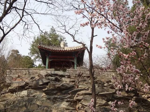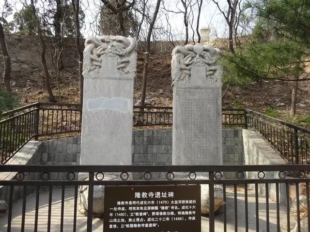 (2)隆教寺,成化年间太监邓铿建寺,明宪宗朱见深敕谕寺名。孙承泽时期,这里尚有僧人守寺,称“境地深邈,可供趺跏”,是个修行打坐的好地方。它在卧佛寺之北侧,有明碑及古树尚存,这处遗址今天已被休整为一精致花园,有小桥流水,并山墙维护,游人罕至。