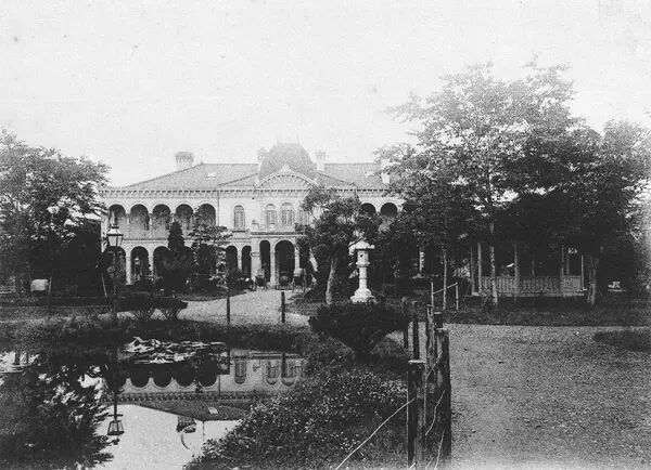 这一带在江户时代是萨摩藩(鹿儿岛)的别邸,江户人称之为“装束宅邸”,距离江户城正门约一公里半。之所以被称为“装束宅邸”,是因为琉球使节进江户城时,都会在此更衣。鹿鸣馆正门正是“装束宅邸”大门,俗称“黑门”,曾被指定为国宝,可惜在昭和二十年(1945)毁于空袭。