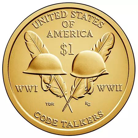 2016年的硬币背面图案是,一个代表一战的布洛迪钢盔和代表二战的M1钢盔,背后两根组成V型的羽毛,象征在两次世界大战中,用本部落语言为美军提供天然密码的那瓦霍印第安人的贡献。2000年由李安导演,尼古拉斯·凯奇主演的二战影片《风语者》就讲述了这些那瓦霍密码员的故事。