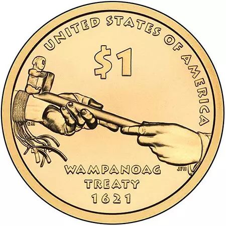 2011年图案是,阿尔衮琴族瓦帕浓部落大酋长Ousamequin和普利茅斯殖民地总督约翰·卡弗手持仪式烟杆,首次正式签署和平同盟协议。这是印第安人与欧洲人之间的一个“平等条约”。尽管这个好的开端并没有续写幸福的故事。