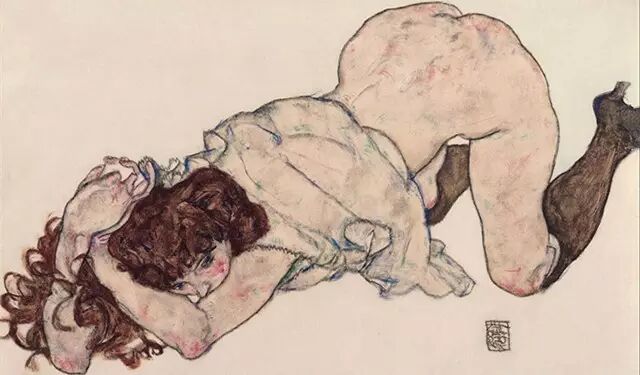 在《肘部支撑的裸女》(1914)、《俯卧的裸女》(1917)、《躺着的女人》(1917)、《跪着的女孩》(1917)和《抱腿而坐的女人》(1918)等作品中,这些女人永远是激越的,紧张的,或者就像经常用以形容席勒的那样,是暴躁的。她们很消瘦,身上的少量肌肉却很结实。每每叉开双腿,暴露着性器官,似乎肆无忌惮,却又异常痛苦,而且还拒绝任何抚慰。