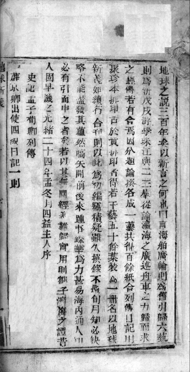 廖平便熟悉这部在当时流布甚广的日记。他在光绪二十四年所著《地球新义》中便大段引用薛著,以助其观点的成立。廖平就在这部书当中提出了一个新颖的观点——通过“翻译”来消弭新知与旧知之间的隔阂。廖平应该也明白,虽然他这是出于打赢经学之战的目的,但这样前所未有的论述仍然可能会遭到不测。因此就在他听闻到新党遭到镇压的时候,毅然将此书稿付之一炬。后来他还是在此年将该书刊印出来,而书中不同篇章的作者却被冠以他学生的名字,“托之及门课艺” ,这也正是为了防止受到其他人的攻击。