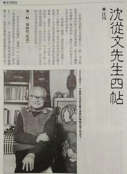 《沈从文先生四帖》一文的“四帖”分别是“德国的‘沈迷’”、“《龙朱》的故事”、“《边城》山外山”、“探骊得珠《月下小景》”。文章一开头就说:“从慕尼黑搬来西雅图不久,第一次去华盛顿大学东亚图书馆阅览室,兴冲冲翻开中文报纸,万没料到,赫然入目的竟是沈从文先生过世的消息。”而作者在文尾署日期时尤为哀感惊叹:“七月十四日稿完。距先生辞世已两个月了!”