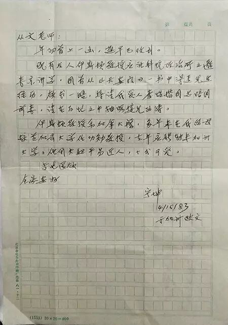 现有友人伊斯顿教授应社科院政治所之邀请来京讲学,因为从《天安门》一书中得悉先生经历,欲求一晤,特请我爱人李怡楷同志陪同前来,请在百忙之中抽暇接见为祷。