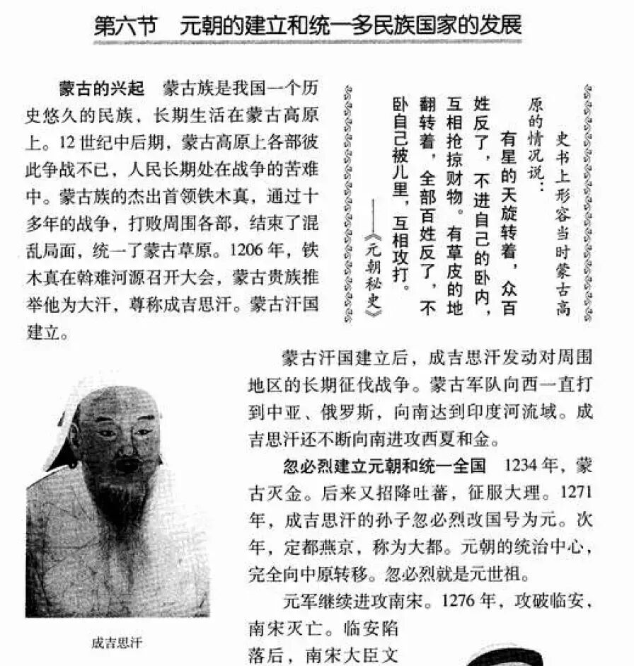 不过话说回来,有此误解又一点不怪,元朝是首个由北方游牧民族入主中原建立的大一统王朝,它的产生 过程相当复杂,甚至对大众来说有点“一团乱麻”。人教版高中历史教科书在疆域图上没有太大问题,但是文字表述也容易给人造成误解,没有把传承关系和演变过 程大致讲清楚,人们常把“蒙古帝国、元朝、蒙古四大汗国”搞混淆,出现误解亦属正常。
