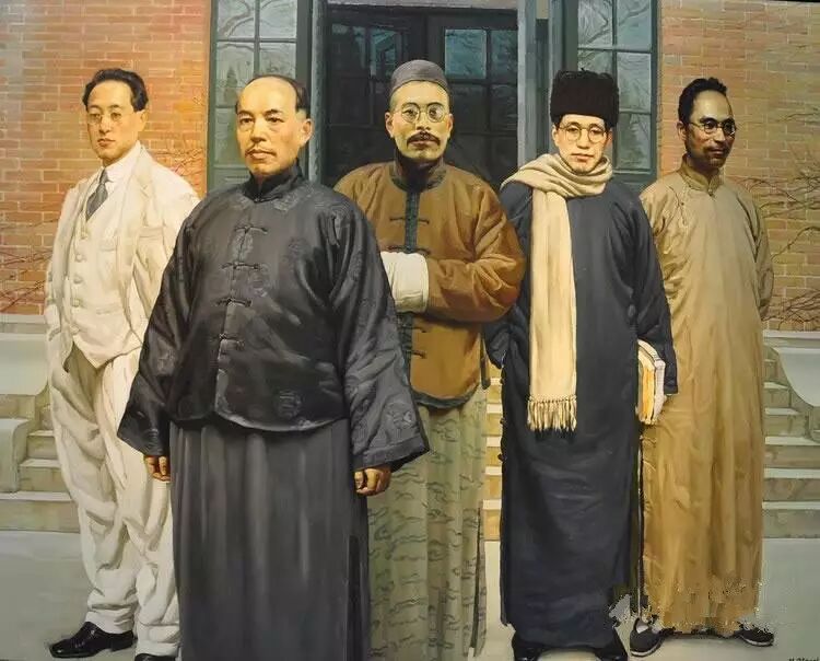 陈丹青《国学研究院》,从左至右赵元任、梁启超、王国维、陈寅恪、吴宓