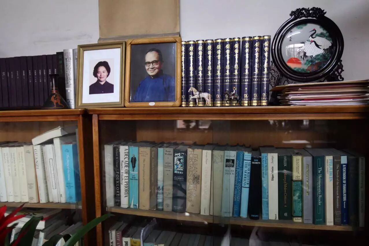 书柜顶上一排,摆着三联书店的《钱锺书集》、商务印书馆的《钱锺书手稿集·容安馆札记》《钱锺书手稿集·中文笔记》,这些都是钱先生身后出版的。前面相框里放的分别是钱锺书先生和钱瑗女士的照片。