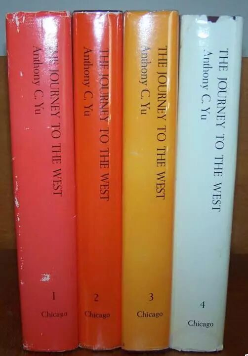 我们从左到右依次看来。左边这一柜里,放的可能都是关于中国的。开首的一溜四册,白色书脊,这是余国藩(Anthony C. Yu,1938-2015)先生翻译的《西游记》(The Journey to the West),芝加哥大学出版社出版,与网上的图片比较,网上的版本只有第四册是白色书脊。不清楚钱先生的这一套是什么时间印的。