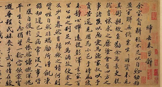 七个世纪以后,在黄州,在人间最孤寂的角落,苏东坡真正读懂了陶渊明,就像两片隔了无数个季节的叶子,隔着几百年的风雨,却脉络相通,纹路相合。张炜说:“他们都是出入‘丛林’(指官场丛林)之人,都是身处绝境之人,都是痛不欲生之人,都是矛盾重重之人,都是爱酒、爱诗、爱书、爱友人、爱自然之人。”苏东坡一遍遍地抄写《归去来兮辞》。时至今日,我在台北故宫博物院打量这件手稿原迹,仍见湿润冲淡之气在往昔书墨之间流动回转。那是他在书写自己的前世——他在词里说:“梦中了了醉中醒,只渊明,是前生。”写字的时候,他就成了陶渊明,而黄州东坡,就是昔日的斜川。