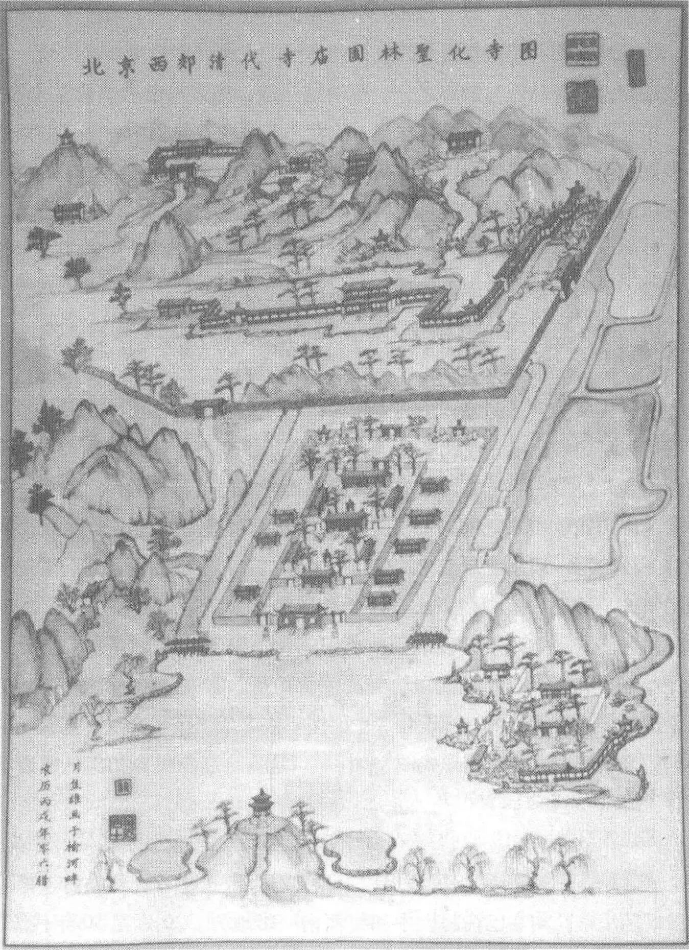 圣化寺的修建记载说是康熙年间,具体哪年开始哪年完竣都不清楚。现在看来,应该是康熙修葺畅春园之后,又向西建造了西花园,那么再向南2里地的样子又营建了圣化寺。圣化寺附近有明代遗庵——延寿庵,也顺手修理了一番(五城寺院册)。总之,圣化寺不仅仅敕建,根本就是皇家专属的花园式寺院。