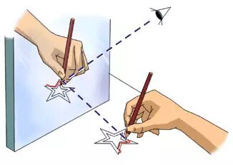 ▲ H.M.只能看到自已的手和五角星形状的镜像,而他需要反复地画出五角星的形状