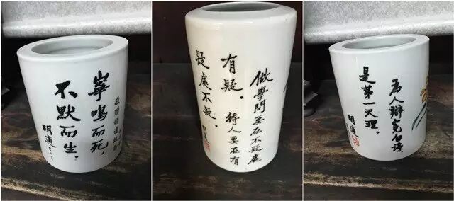 我所喜欢的是三只花瓶上烧制的名言:一是“宁鸣而死,不默而生”,讲的是对言论自由的追求;二是“为人辩冤白谤,是第一天理”,讲的是坚守良知而追求公正;三是“做学问要在不疑处有疑,待人要在有疑处不疑”。第一句出自宋代名臣范仲淹,第二句出自明朝学者吕坤,都是胡适引以为座右铭的。第三句是胡适自撰,是他坚持和倡导的做学问与做人的原则。好像都不是文物,是1980年代胡适故居修复时,文化人敬送的仿制品或工艺品吧。也算得上胡适的知音了。