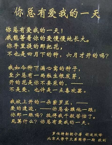 绩溪故居有一个展室的门边,竖立一块黑底金色字迹的诗碑,上刻着一首诗《你总有爱我的一天》: